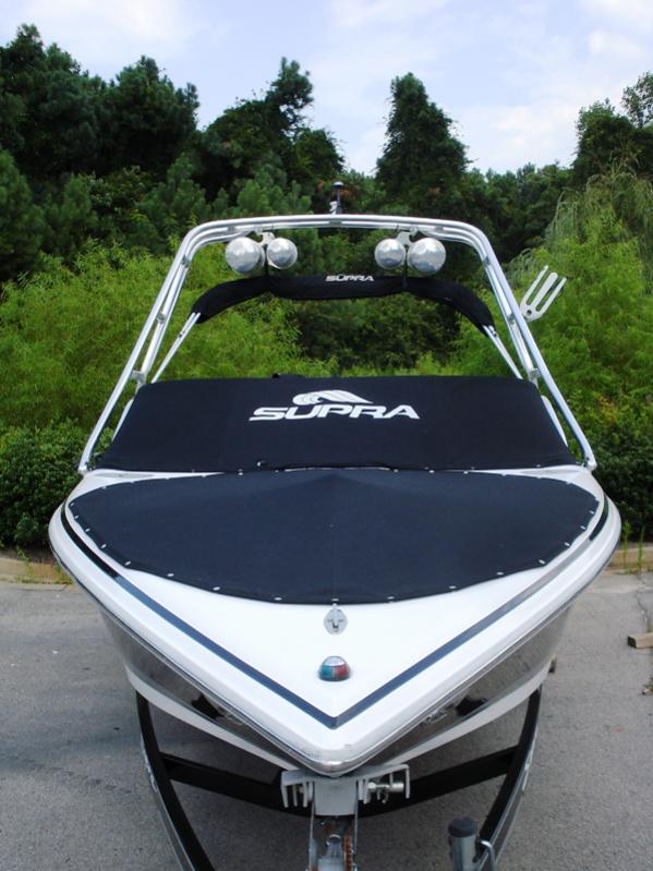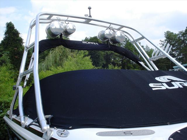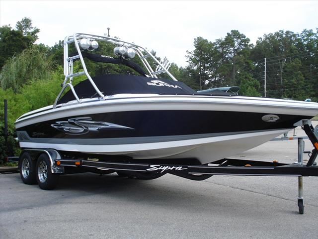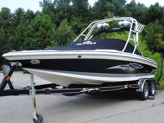 Really nice low hour loaded 23 foot Supra Santera for sale. This boat has nearly everything you could want in an inexpensive wakeboarding boat. It has the tower, tower speakers, amp, bimini top, snap on covers, walk through transom, Perfect Pass speed control, factory trailer and a 5.7 350 V8 with only 350 hours. This is a great all around watersports boat.