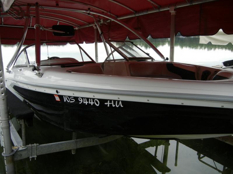Below are 3 images, one that just shows our boat looking all nice, and the other 2 pics are of each side of the bottom of the boat showing the crack as it creeps up the hull. Again, the location is right below where the ski locker ends and the fuel tank begins.