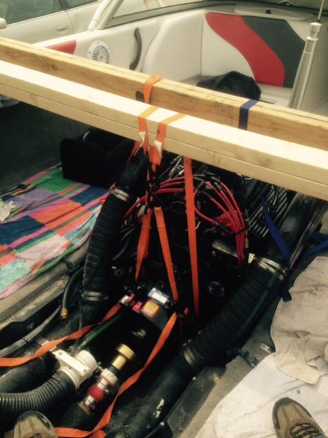 Step 5. Now it's time to support the engine. I took the hook on the front of the left bank cylinder head and put it at the rear so I had two hooks equally spaced. I'll probably take a beating for my hoist but it worked just fine. I also put a couple pieces of wood under the engine as secondary supports. The transmission was supported in the same way, it's not that heavy and this is just an interim step while you loosen the bolts.