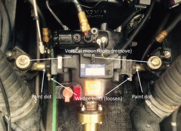 Step 7. Ok now with the engine and transmission supported it's time to remove the vertical motor mount bolts, you will also want to loosen the horizontal wedge bolts (which control the side to side position of the engine/transmission. Before loosening anything put paint dots on the vertical bolt threads right above the transmission crossbar and on the crossbar where the wedge bolt is, this is just to get you close when you put it back together, you will still need to do an alignment. After you mark the current postion, loosen the wedge bolts and remove the vertical mount bolts . For the vertical mount bolts you will need to loosen the locking nut above the cross bar and then get a 15/16 box end on the nut on the very bottom. You'll need to move the locking nut down as you loosen the mount bolt. I read some other posts for older boats where they removed the mount right off the transmission, there is not enough room on the 05's.