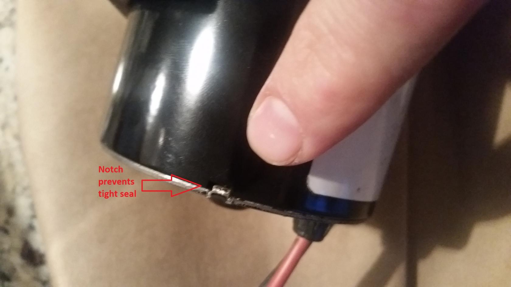 Water dripping from transom mounted cup holder onto the ballast pump motor can breach the motor casing on pumps mounted sideways. This is possible because the pumps have notch gaps in them and are not waterproof.