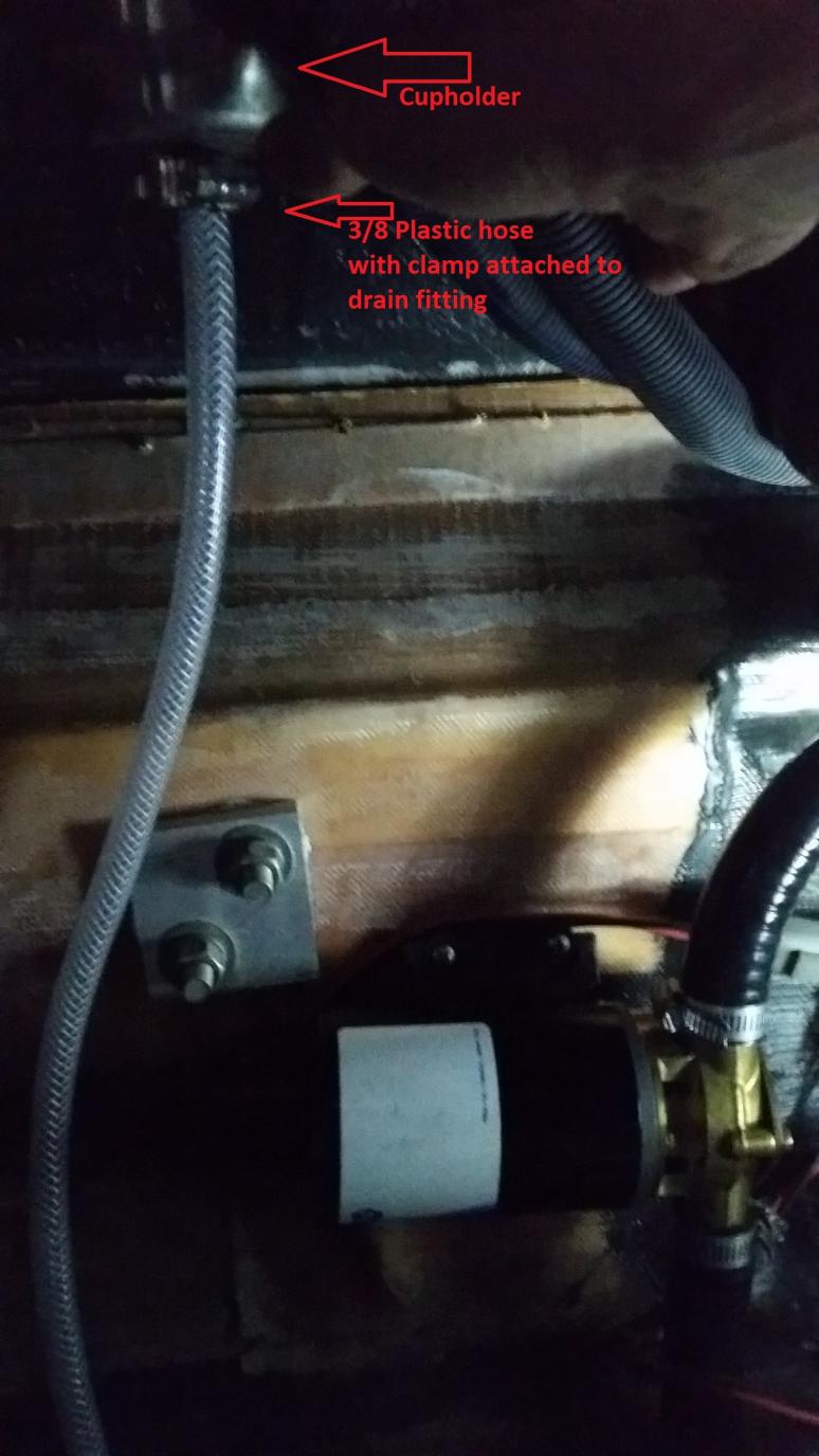 b. Install drain hose to cup holder draincock which will route all water directly to bilge area.