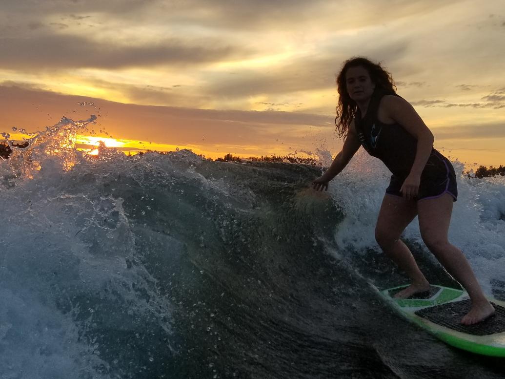 Our daughter surfing after midnight during our long summer days in Alaska. Sun in just starting to set. She is behind our 2016 Craz.
