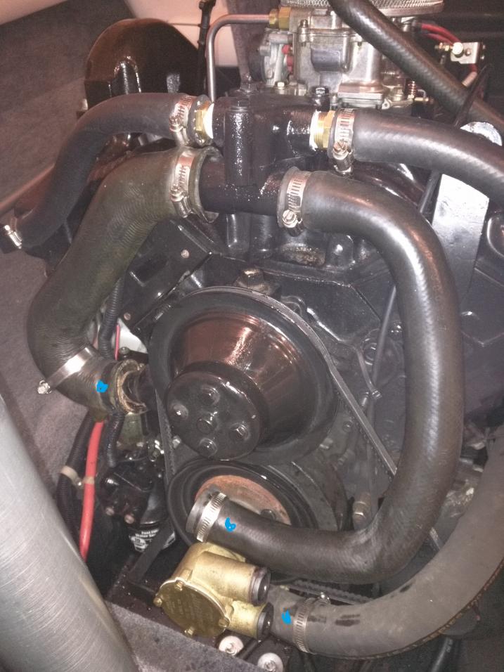 4 - Disconnected both hoses to fresh water pump and hose to lower thermostat housing and drained. Pictured here in Blue.