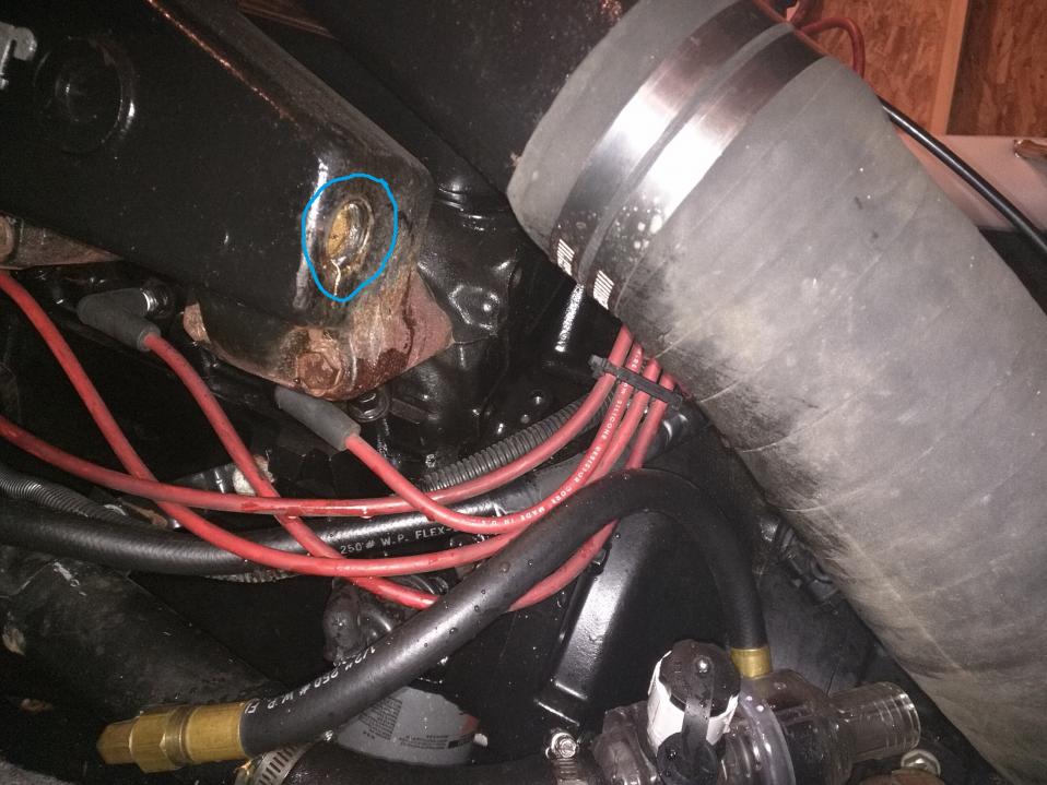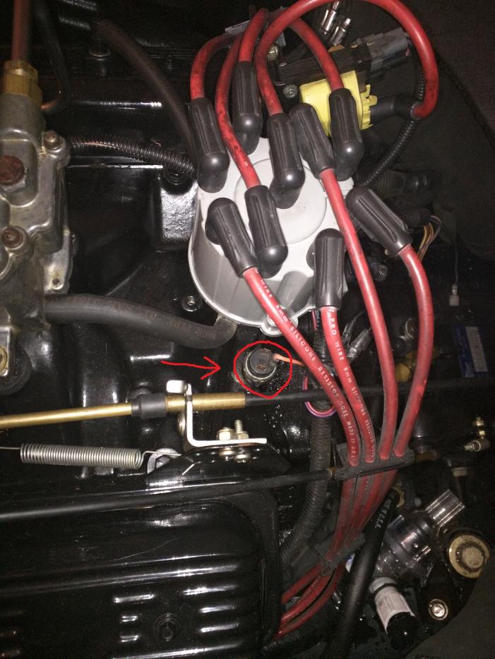 Lastly, help me identify this part. Indicated by the red arrow and circle. It looks like its been removed in the past with a pair of channel lock pliers. The collar of it is sorta chewed up and stripped of black paint.