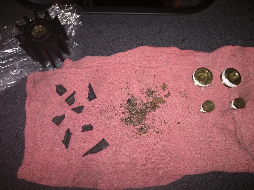 The impeller I took out was intact and appears to be new but when I drained the exhaust manifold ports, rust and chunks of old impeller came out (see picture). Does their presence in the exhaust mean I should check elsewhere (thermostat housing) for more chunks?