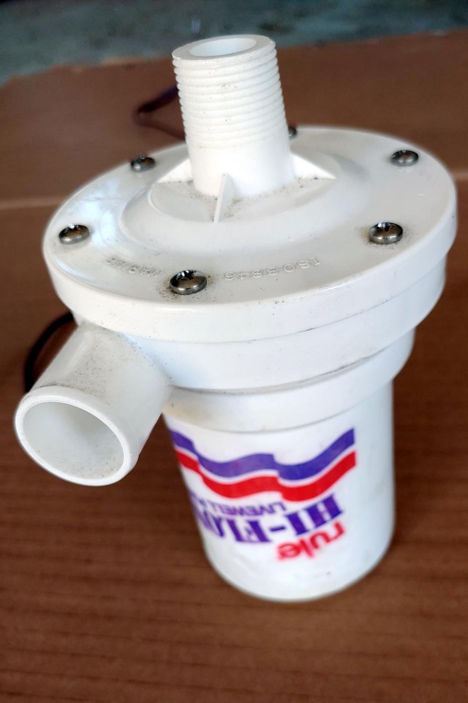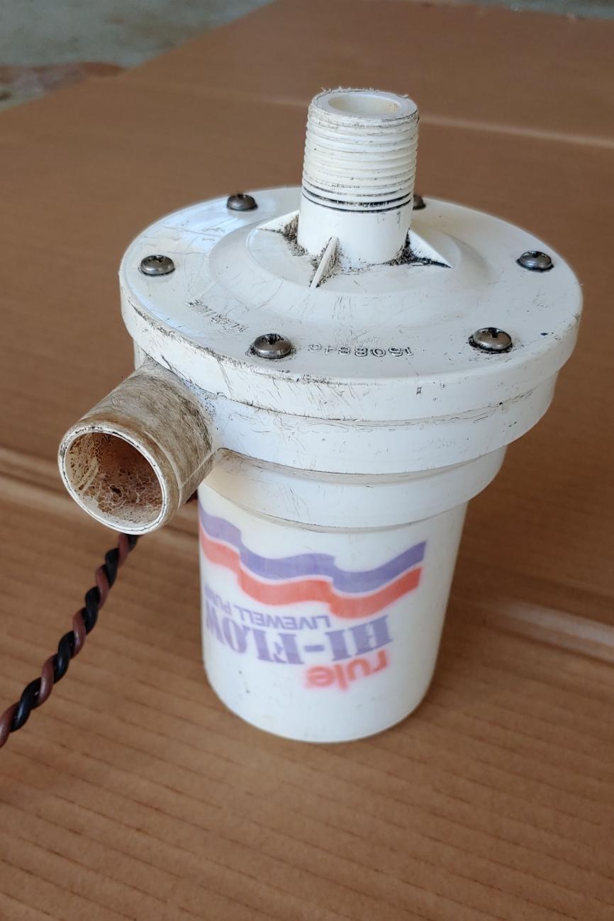 I have 3 of these available. Two in this listing and one in another one. They are all the same pump. These are Rule 2000 livewell pumps that were used as original equipment in the aerator ballast systems. I believe they are rated at 1200 GPH. They have been in a box for a couple years since I changed my ballast system over. The box fell a while back and two of the pumps suffered cracked housings. They were repaired and you can see the results in the photos. The pumps work; all were tested today. The cracks were not to the part of the pump that moves the water but to the plastic part that houses the motor. So, while I would be confident using them in the boat I would not use them as submerged "throw over the side" pumps unless you want to use a sealer around the housing first. The prices reflect working condition but with the above stipulations.