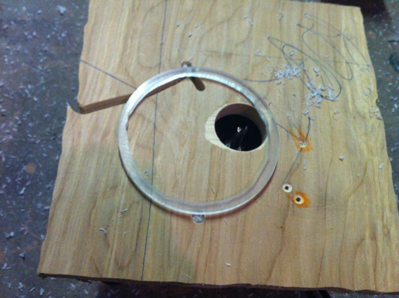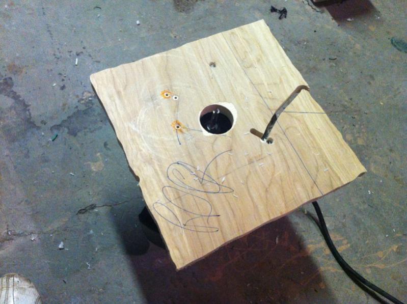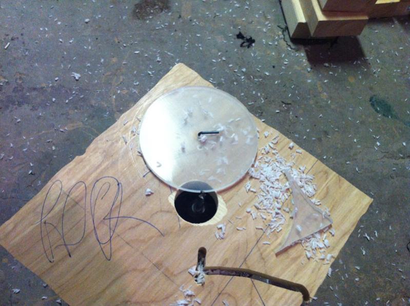 I measured out radius for the inside and outside of the circles and drilled a hole in the "table" for each, and marked them with an orange highlighter so I remembered which were correct (it was a trail and error process).