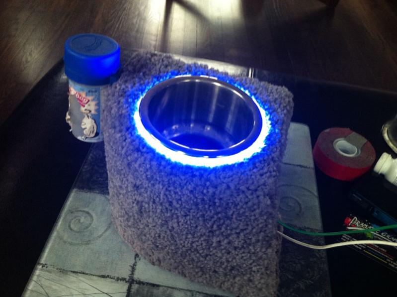 This is where the cup holder rings are a little different than the speaker rings; because the thickness of the ring is less than the LED, I stuck the LED strip directly to the cup holder, rather than gluing it to the ring. Once I had the LED in place I slipped the ring over top, and gave it a test fit;