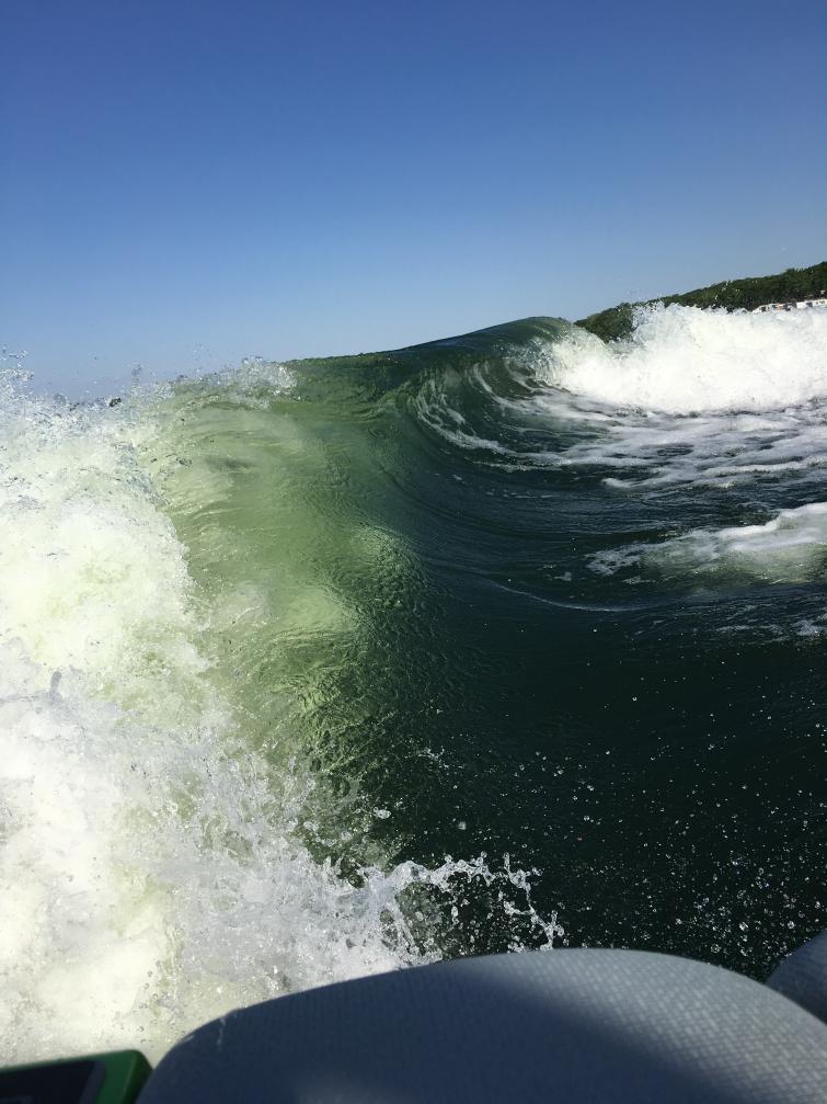 Finally got a full crew of 11 people, all bags full (4200lb), wake plate all the way up, surf tab at 55, and speed at 10.6mph. The wave looks massive but is shorter (in length) than desired. I adjusted the wake plate down to get a longer wave but the push was greatly reduced. Very surfable but lacked a solid defined lip in the front of the wave to boost airs. The goofy side looked good as well with the surf tab setting at 100% but I did not ride it personally. The fully loaded boat struggled to get on plane with the 15x13 prop, thinking about upgrading to a 14.5x12.