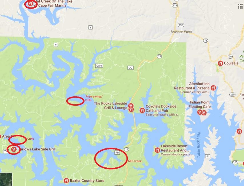 We have been there a week a time for a few years. These are the places we have been to. The 2 spots I marked with cliffs / rope swing are a good time! The 2 circled restaurants were good food with boat slips and a good cruise up to. Mill Creek cove is a good spot for nice water. I am sure there are many other good spots though. We spent most of our time between there and the rope swing area. Also what's up dock marina is really close to there at Kimberling City for any needs.
