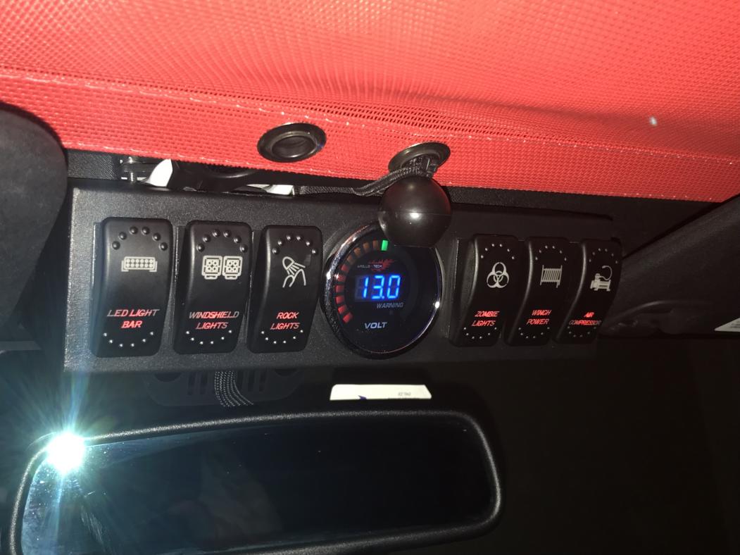 Quadratec J5 light bar w/amber clearance lights, Rugged Ridge fast track mount, 2 q-tec LED cubes, and an apollointech switch pod/controller to run the lights. oh, and we added hood mounted Hi-Lift jack.