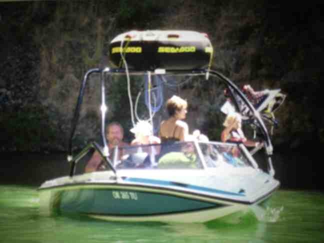 So in going through even more pictures for the celebration of my Dad's life tonight I found one of him driving my old boat at LBC (must have been the first year I put the tower on it: no mirror and 1 board rack:) )