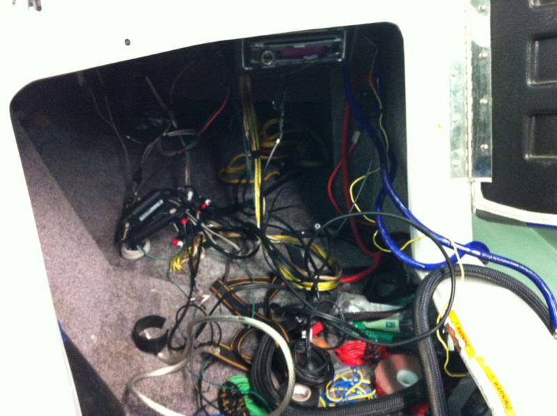 Last night I got down and dirty with pulling the remainder of the old equipment out, as well as re-routing a bunch of wiring and such. It seems that since I built the stereo in stages, there was not much organization to the wiring (IE: a wire added here, another there) so I decided to pull it all out and start from scratch.