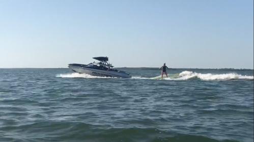 Sinking the boat down in the water allows the hull to plow through the water and help create the wave. Notice how even the boat sits in the water, no list, no bow rise.
