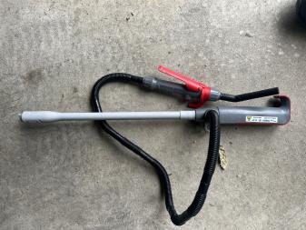 I just went online and found the parts I used to post some pictures. I know I only paid 30 bucks for the rubber gas line and handle, but that was about 4 years ago. I did buy 10' long hose, but ended up cutting it in half down to 5'. The plastic chemical resistant fittings I bought at tractor supply. I tried taking a picture down in the barrel where I mounted the bulkhead fitting. This particular barrel had a flat spot down there with a raised ridge inside it that happened to allow me to drill my hole so that one of the flat spots on the bulkhead fitting nut butted up against it. That held the nut in place allowing me to tighten it from just the outside. Threaded the elbow into that and then claimed the gas hose to it. Super simple. If you're fill cap on the boat sits lower than the barrel, gravity feed is all you need. Notice I did make a small wooden platform for the barrel to sit on so the elbow fitting would clear the ground. I just screwed it to the plate on the metal dolly. The barrel is held on the dolly with a ratchet strap.