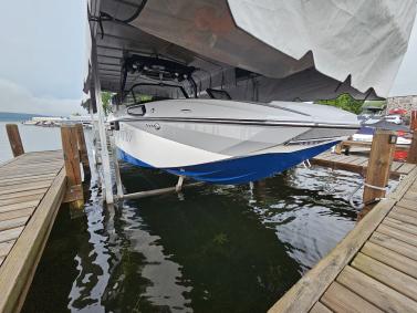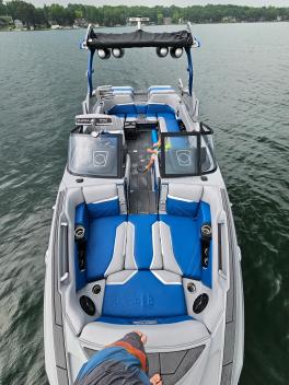 My dealer was out today giving her a shakedown to be ready for tomorrow. Interior looks pretty slick and I like the gatorstep to bring a little of the blue inside the boat.