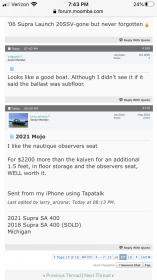 Nice. Not a bad deal either. I thought it was going to surely top 100k. I built a 400, with dual batt, 7"screen, depth finder , maps, 10" wetsounds on tower, Bimini, swivel racks, heater, G6 ballast, GS and MRSP came south of 95 k. Should be < 90k with discounts and well below 100k OTD with taxes/fees. That is a true value proposition.