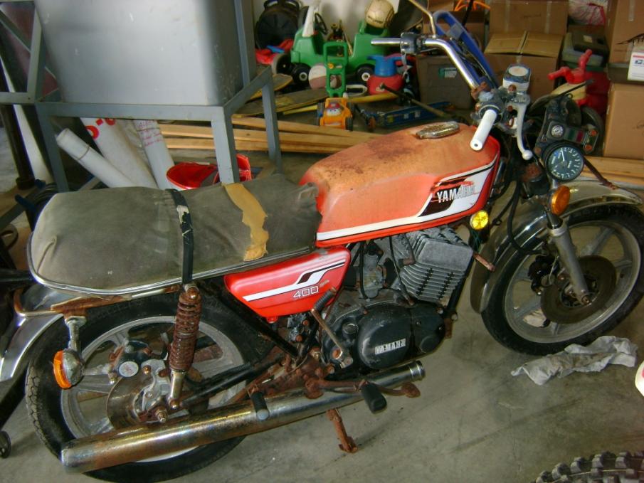 Here's a project bike, which is currently stripped down for rebuild. We're hoping to get it going to Cam's first bike this summer, but we'll see. it is a twin-cyl 400cc 2-stroke!