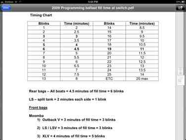 Rear bags – All boats = 4.5 minutes of fill time = 6 blinks LS – split tank = 2 minutes each side = 1 blink