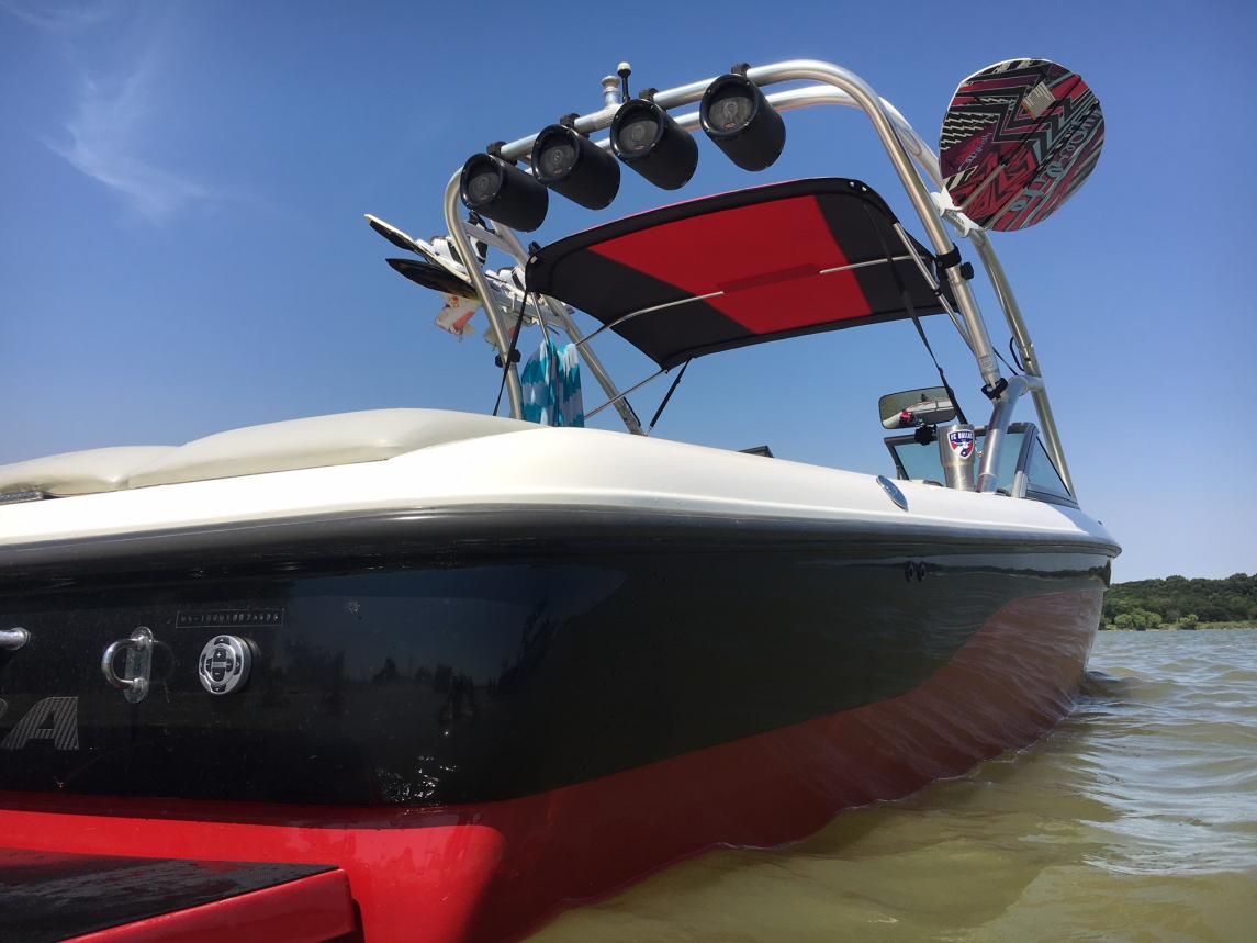 Got a few things going on here. Painted my Exiles to match the boat, installed Roswell Triton racks. Custom made a spacer to be able to run the factory swivel racks on the upper mounts. Picked up a Fly High rope extender to help keep the rope out of the racks and tower, works pretty well with the forward towers like the OZ and V2. Put in a Cipa 180 mirror with the Cipa mount. I also took the folding light off and installed a flush mount removable anchor light that extends up above the bimini and speakers.